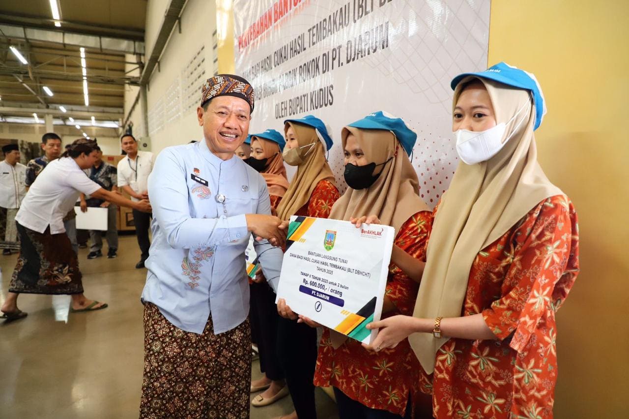 Bupati Kudus Sam’ani Intakoris secara langsung menyerahkan bantuan tersebut kepada buruh rokok di PT Sukun Wartono Indonesia, Desa Gondosari, Kecamatan Gebog, serta secara simbolis di PT Djarum Karangbener, Kamis (3/7/2025).
