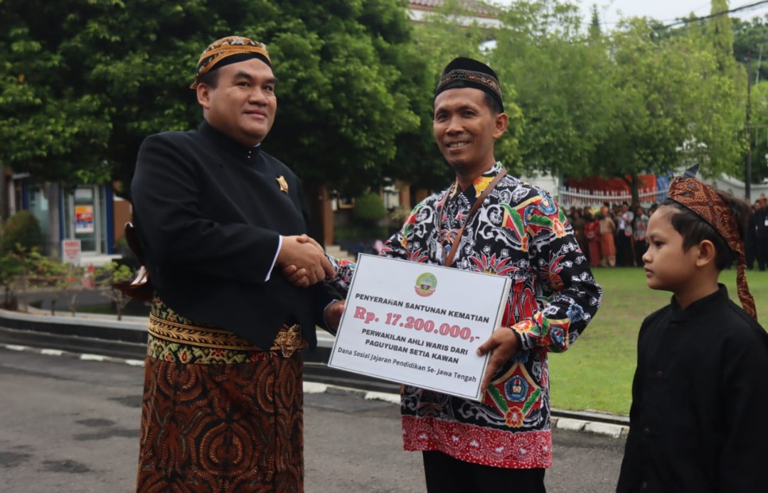 Usai upacara, Bupati Blora bersama Wakil Bupati dan Forkopimda menyerahkan sejumlah bantuan sosial. Di antaranya santunan kematian kepada ahli waris anggota Paguyuban Setia Kawan Dana Sosial Jajaran Pendidikan se-Jawa Tengah.