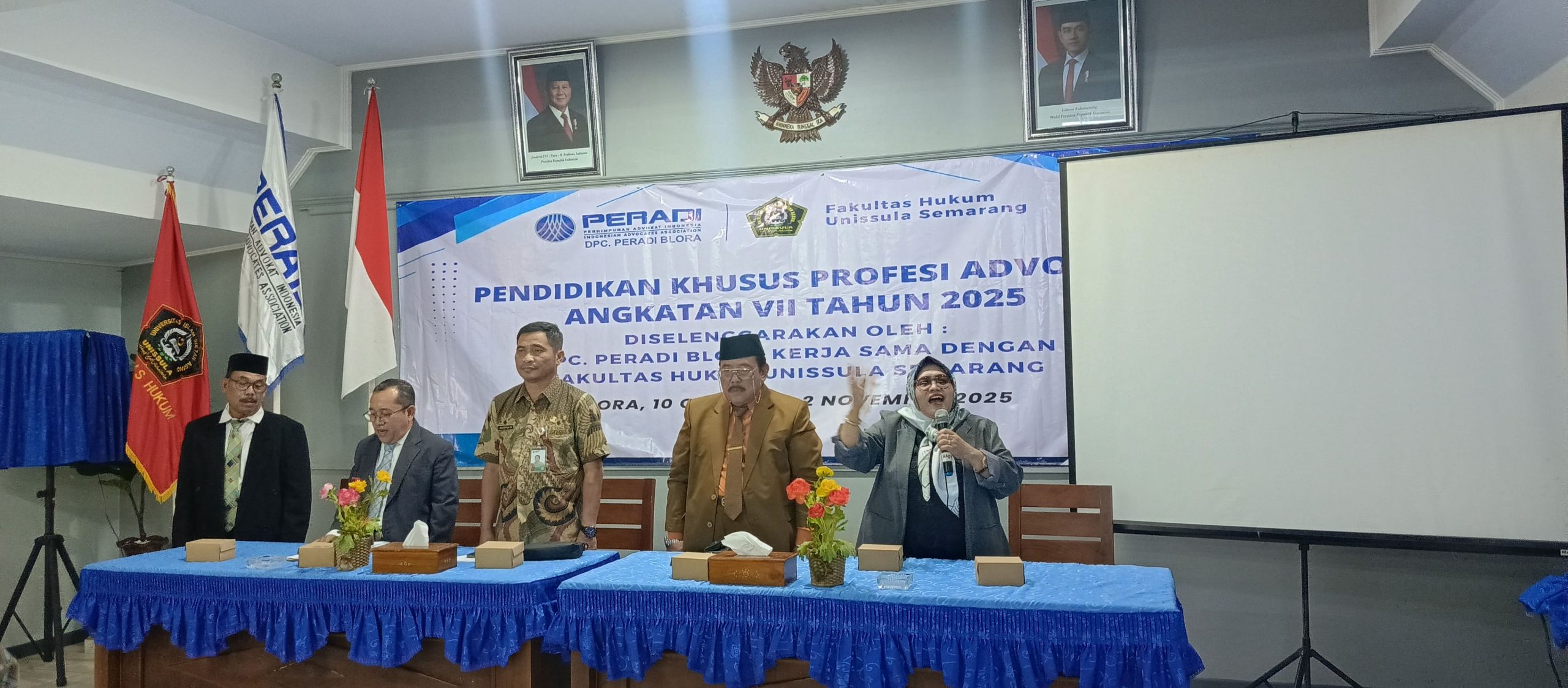 Zainuddin juga menyampaikan apresiasi atas dukungan penuh dari DPN PERADI serta kerja sama yang baik dengan Fakultas Hukum UNISSULA Semarang. Menurutnya, sinergi ini telah menghasilkan banyak lulusan berkualitas dari Blora yang berhasil lulus Ujian Profesi Advokat (UPA) dengan tingkat kelulusan 100 persen.