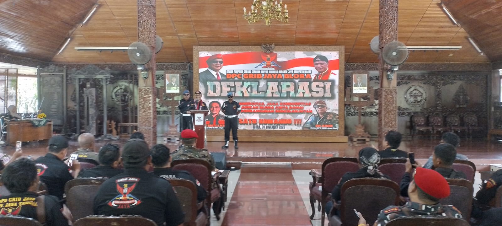 Klikjateng, Blora – Dewan Pimpinan Daerah Gerakan Rakyat Indonesia Bersatu (Grib) Jaya Kabupaten Blora resmi menggelar deklarasi organisasi dengan mengusung tema “Jalin Sinergitas, Jaga Kondusivitas, Wujudkan Blora Cinta Damai, Kawal Pembangunan Berkelanjutan.” Kegiatan tersebut berlangsung hangat dan penuh semangat kebersamaan, dihadiri jajaran pengurus DPD, DPC, PAC se-Kabupaten Blora, para donatur, serta sejumlah tamu undangan. Kamis (20/11/2025).