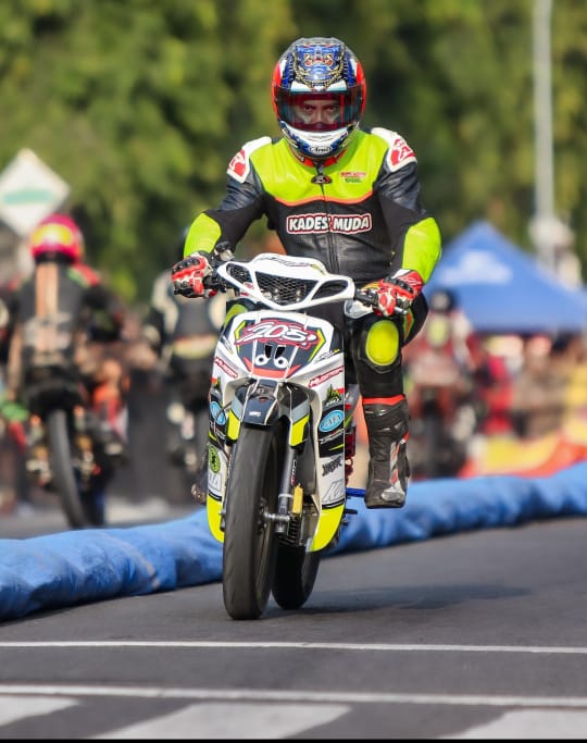 Nama “Kades Muda” yang tersemat di seragam balapnya ternyata menyimpan cerita tersendiri. “Pada tahun 2017 saya balap dengan bos dari Madura, beliau seorang kades muda juga. Waktu itu nama timnya ‘Kades Muda Racing Pamekasan’, dan saya merasa cocok memakai nama itu sampai sekarang,” terangnya.