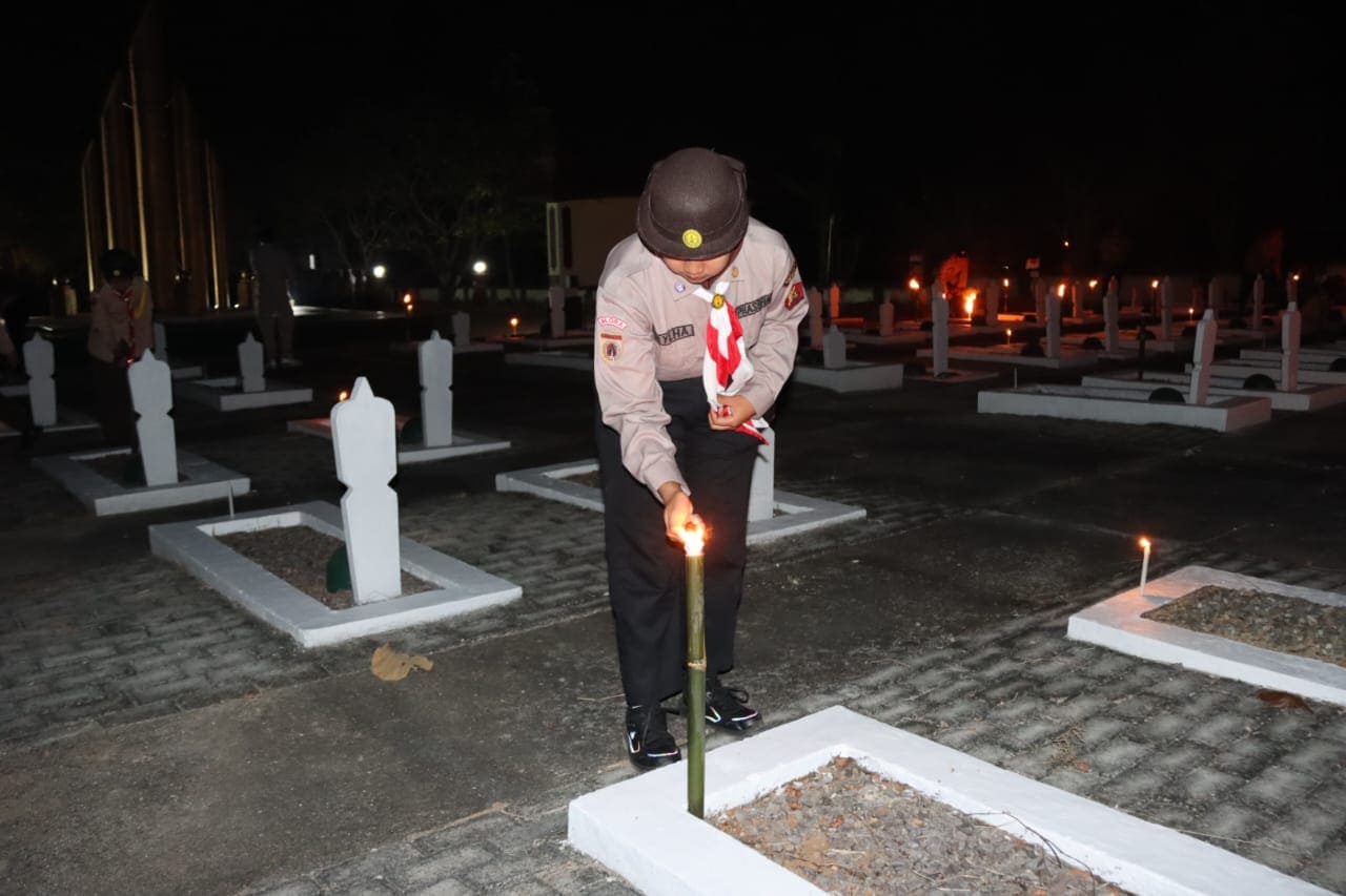 Rangkaian acara berlangsung dengan khidmat melalui prosesi mengheningkan cipta, penyalaan obor, doa bersama, hingga penghormatan terakhir. Cahaya obor yang dinyalakan Pramuka di area makam semakin menambah kekhusyukan suasana renungan malam itu.