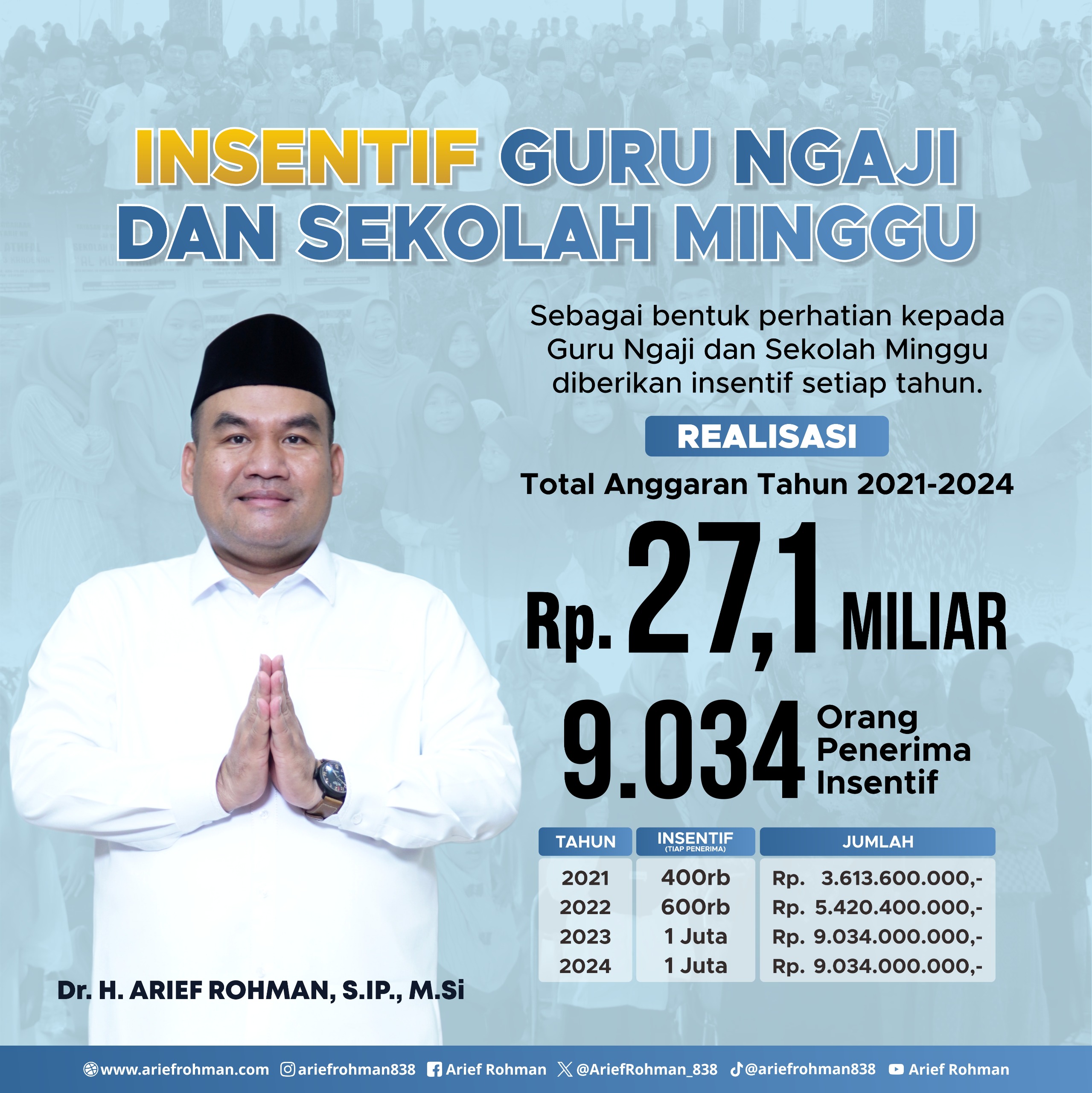 Selama empat tahun terakhir, sebanyak 9.034 Guru Ngaji dan Sekolah Minggu telah menerima insentif tahunan dengan nilai yang meningkat setiap tahunnya. Pada 2021, insentif diberikan sebesar Rp400 ribu per orang dengan total anggaran Rp3,6 miliar. Pada 2022, insentif meningkat menjadi Rp600 ribu per orang dengan total anggaran Rp5,4 miliar. Tahun 2023 dan 2024, insentif naik menjadi Rp1 juta per orang dengan anggaran masing-masing sebesar Rp9,034 miliar.