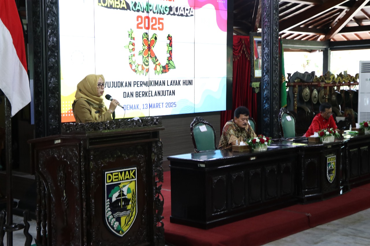 Klikjateng, Demak – Pemerintah Kabupaten Demak melalui Dinas Perumahan dan Kawasan Permukiman (Dinperkim) secara resmi menggelar Sosialisasi Lomba Kampung Juara (LKJ) 2025 pada Kamis (13/3/2025) di Pendopo Kabupaten Demak. Acara ini dipimpin langsung oleh Bupati Demak, dr. Hj. Eisti’anah, serta dihadiri Sekretaris Daerah Akhmad Sugiharto, Plt. Kepala Dinperkim Ir. H. Nanang Tasunar David Narutomo, MM., camat, dan kepala desa se-Kabupaten Demak.