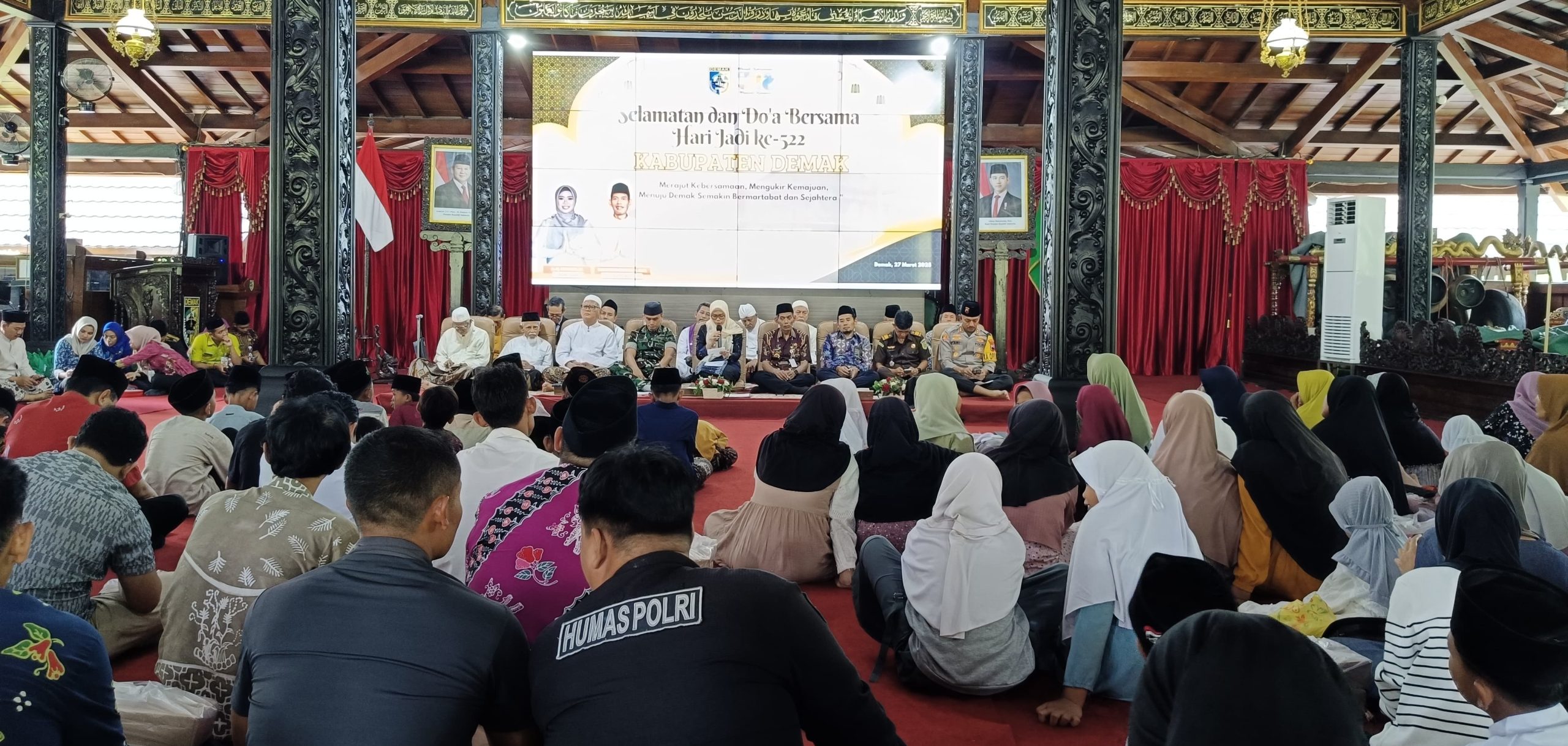 Klikjateng, Demak – Suasana khidmat tampak di Pendopo Satya Bhakti Praja dalam acara selamatan dan doa bersama memperingati Hari Jadi Kabupaten Demak ke-522 tahun 2025, Kamis (27/3/2025). Acara ini menjadi bagian dari rangkaian peringatan hari bersejarah bagi Kabupaten Demak yang jatuh pada 28 Maret, bertepatan dengan penobatan Raden Patah sebagai Sultan Demak pada 28 Maret 1503.