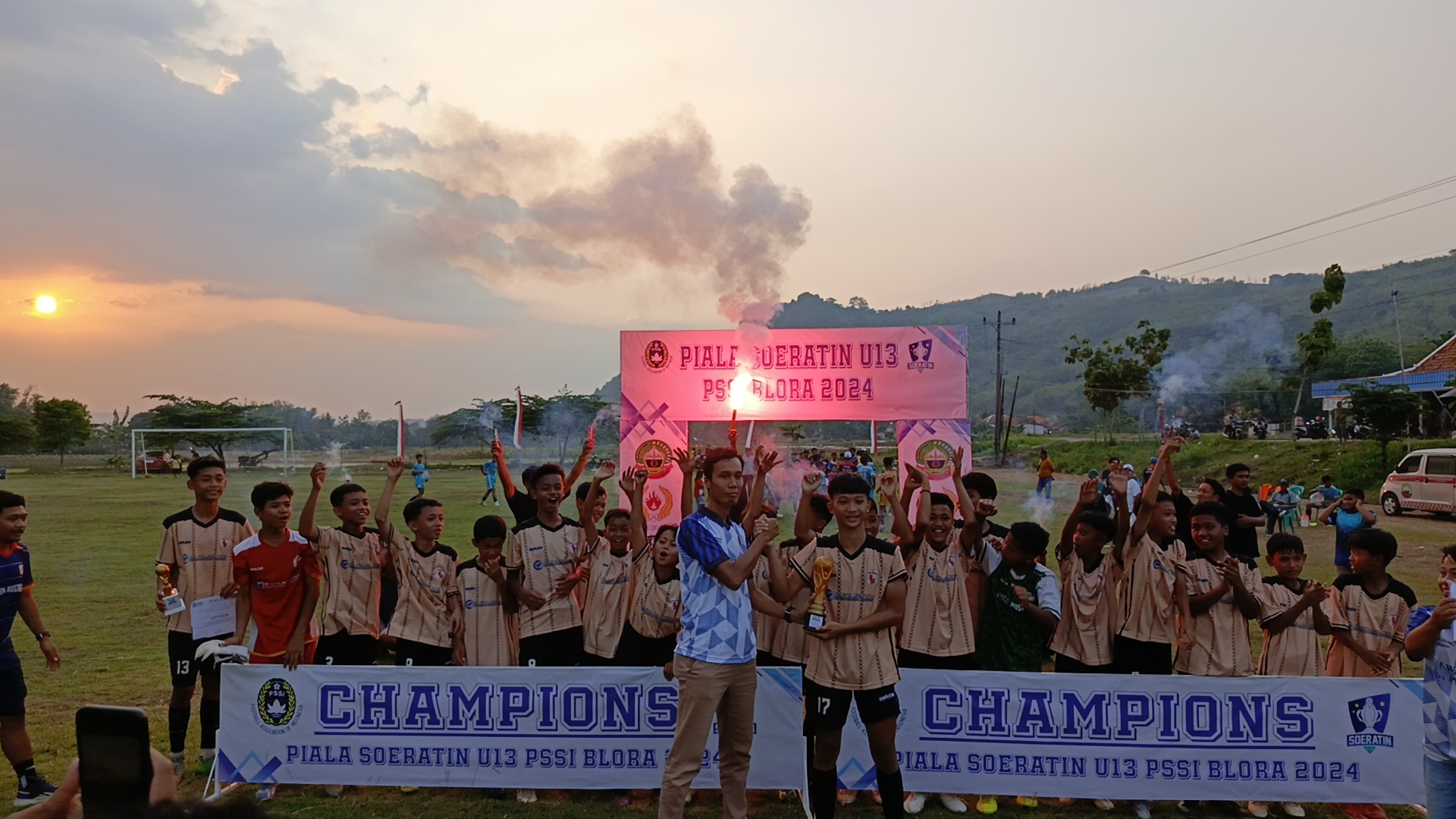 Klikjateng, Blora – Euforia menyelimuti Lapangan Gelora Putar Wukir, Kecamatan Todanan, saat Putra Mustika berhasil keluar sebagai juara dalam Final Piala Soeratin U-13 Askab PSSI Blora 2024. Minggu (27/10/2024). Dalam pertandingan yang berlangsung ketat ini, Putra Mustika menaklukkan Bina Talenta dengan skor akhir 2-0, mengukuhkan mereka sebagai juara U-13 sekaligus melengkapi torehan prestasi hattrick setelah sebelumnya merebut gelar di kategori U-15 dan U-17. Keberhasilan ini menjadi kebanggaan tersendiri bagi Kabupaten Blora dan semakin menguatkan optimisme akan potensi bibit muda yang berpeluang mengharumkan nama Blora di kancah nasional.