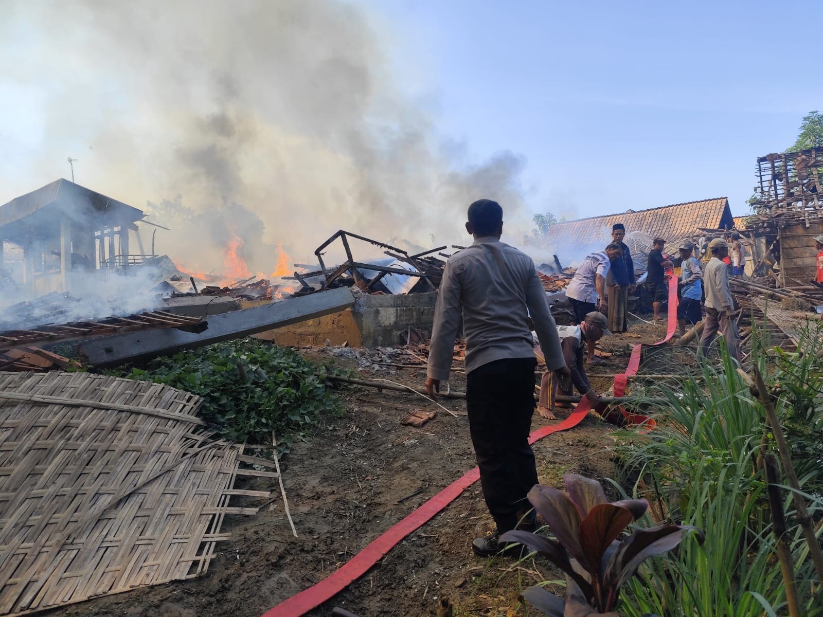 Saat tiba di lokasi, api sudah membesar dan melalap bagian tengah rumah Jamin yang terbuat dari kayu jati model bekuk lulang. Warga berusaha memadamkan api dengan alat seadanya dan menyelamatkan barang-barang, namun api dengan cepat merambat ke rumah milik Tarmuji (42) dan Jiyem (59) yang berada di sebelahnya.